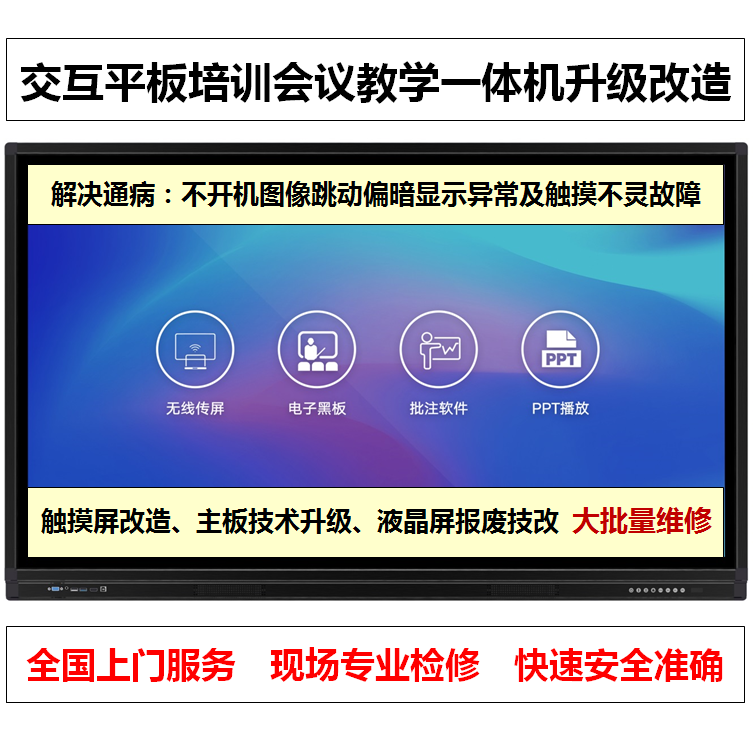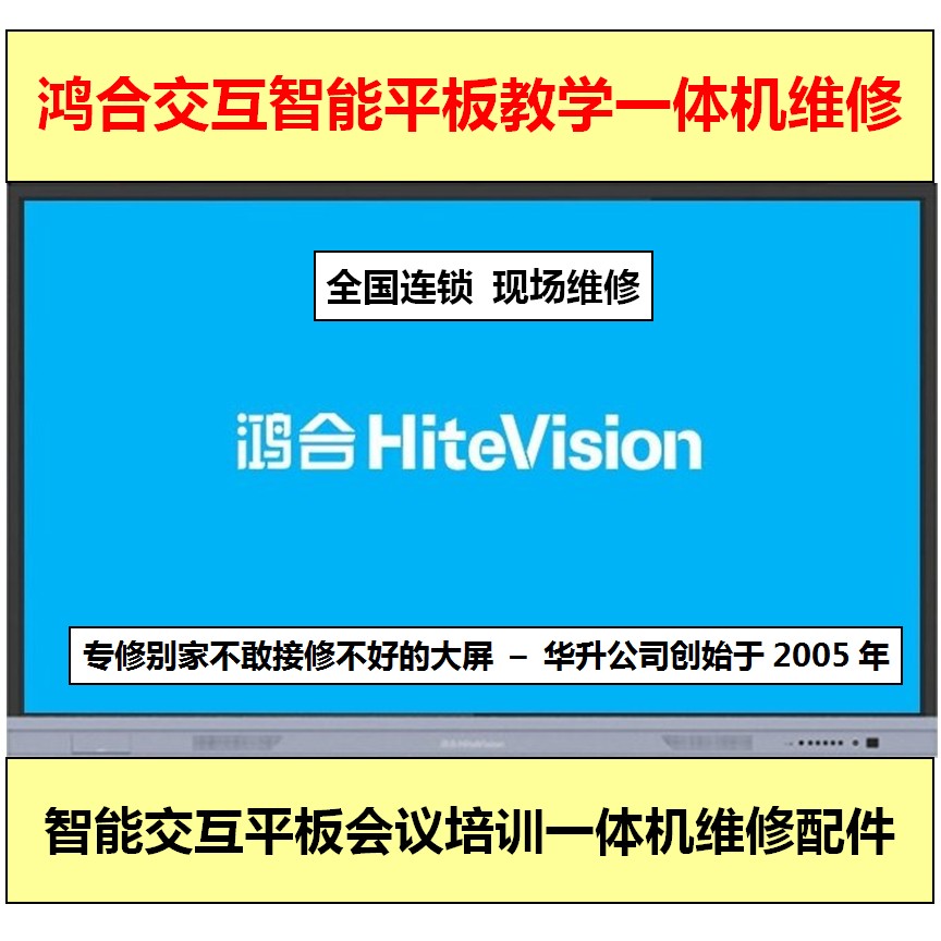 華升液晶屏維修全國(guó)連鎖:提供65寸、70寸、72寸、75寸、80寸、82寸、84寸、85寸、86寸、98寸、105寸、110寸等超大尺寸液晶屏交互智能平板會(huì)議培訓(xùn)多媒體教育教學(xué)觸摸一體機(jī)監(jiān)視器顯示終端遠(yuǎn)程視頻視訊會(huì)議智慧寶數(shù)字標(biāo)牌觸摸觸控一體機(jī)液晶電視機(jī)液晶屏拼接屏全國(guó)上門現(xiàn)場(chǎng)維修及配件供應(yīng)服務(wù)。